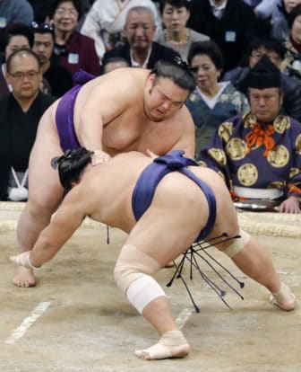 Takayasu tried pushing out and then pulling down the 227-kilogram Mongolian, but was instead forced to the edge by an unstoppable charge. With the contest in the balance, Takayasu teetered on the straw as Ichinojo’s momentum forced him to step out of the ring first.