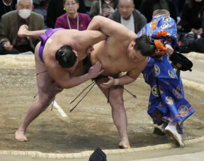 Cherchant à entrer dans l’histoire avec le plus grand nombre de victoires consécutives pour un débutant en makuuchi, Takerufuji a démarré de manière prometteuse avec un solide tachi-ai. Il repoussa Hoshoryu, mais l’ôzeki montra ses remarquables capacités de lutte en faisant tourner Takerufuji et en l’envoyant voler avec un kotenage. Takerufuji, 24 ans, avait battu mercredi Kotonowaka pour égaler le record du légendaire yokozuna Taiho : 11 victoires consécutives sans défaite lors de ses débuts en makuuchi, établi en janvier 1960.