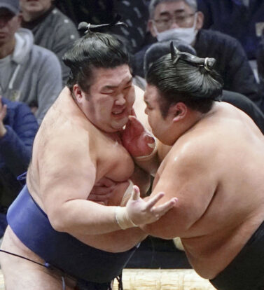 Dans le reste des rencontres marquantes du jour : Ura s’est montré autoritaire avec Kotonowaka. Il a très bien défendu les attaques oshi ou yotsu, et parvient à retourner la tendance en esquivant le corps de l’espoir japonais et en l’envoyant par l’arrière vers la sortie du dohyô. Victoire par tottari, un kimarite plutôt rare. Il s’agit de la première défaite de Kotonowaka ce tournoi. Il a encore droit à 1 joker s’il veut devenir ôzeki à l’issue de la semaine prochaine.