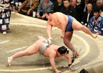 After slapping Kotoshogiku’s face following the initial charge, the Mongolian yokozuna grabbed the 173-kilogram maegashira by the belt and thrusted him down. It was Hakuho’s 56th win over Kotoshogiku (4-5) in 62 bouts.