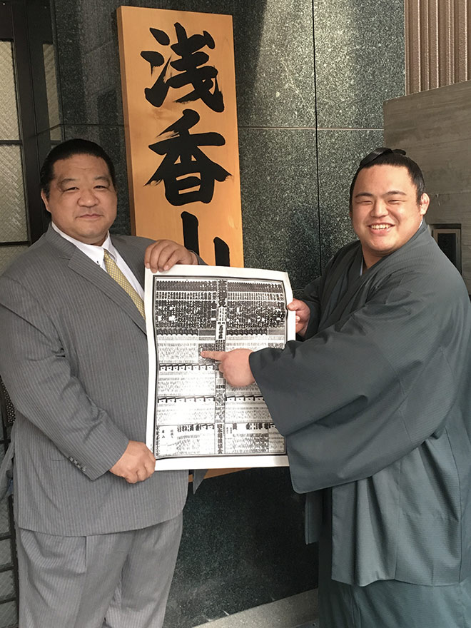 C’est une belle récompense pour Asakayama oyakata (l’ancien ôzeki Kaio) qui forme son premier sekitori (lutteur professionnel).