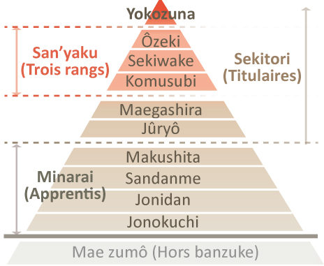La structure très codifiée des rangs et des changements de rang est régie par l’Association Japonaise du sumo (Nihon sumo Kyôkai) qui est elle-même l’émanation des grandes écoles de sumo du Japon. Avant chaque hon basho (grand tournoi se déroulant au Japon tous les deux mois – équivalent des tournois « grand chelem » en tennis), la NSK étudie les résultats du dernier hon-basho et va déterminer la place de chaque lutteur en fonction du nombre de victoires (et donc de défaites), et en fonction de son rang initial lors de ce dernier tournoi.