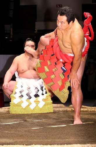 Lors de la cérémonie du dohyô iri, l’ancien Chiyonofuji portait une tsuna rouge symbole de longévité nouée dans le style Unryu.