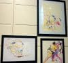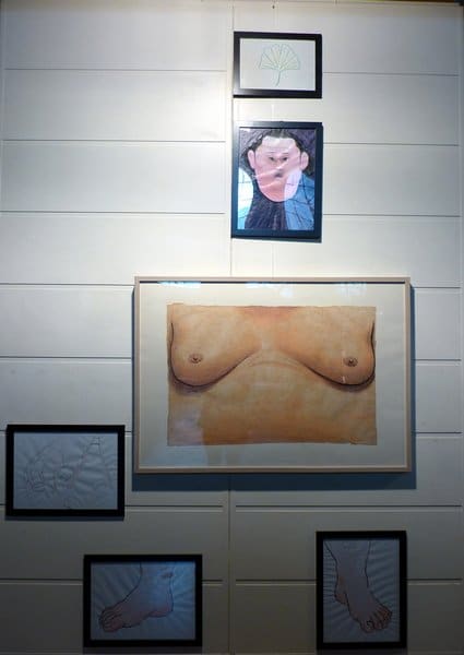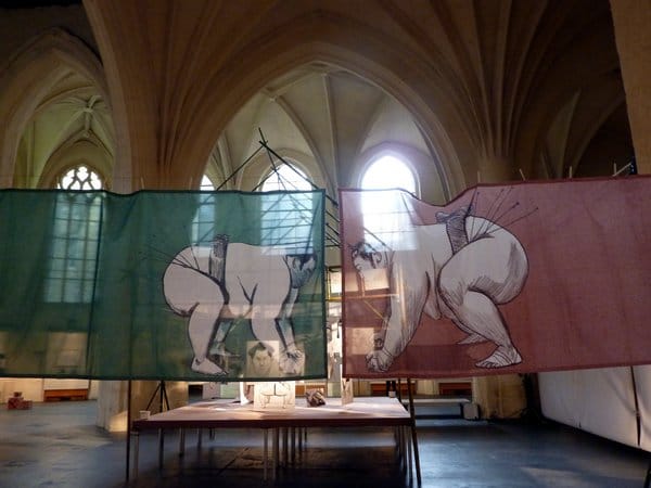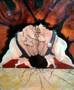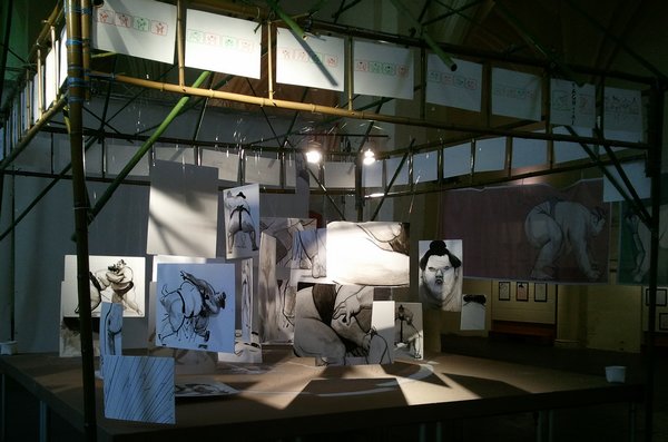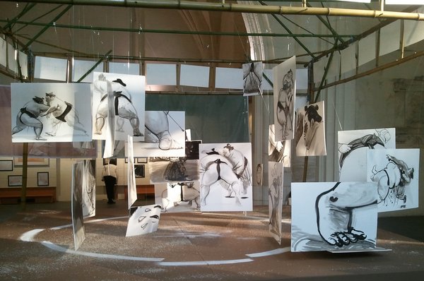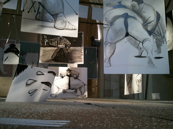 Lors de l’exposition, nous avons notamment reconstitué l’apparence d’un dohyô. Le toit était une architecture de bambous (conçue par mon beau-père) d’où pendaient des cartons plumes (un carton extrêmement léger et blanc). Sur ces cartons (une trentaine) peints au pinceau et à l’encre de Chine recto-verso, deux lutteurs, parfois en entier, parfois des parties de corps. Nous avons disposé ces cartons de manière à reconstituer l’enchaînement d’un combat dans l’espace, en suspension. C’est une sorte de bande dessinée dans l’espace où chaque face d’un carton serait une case. Leur disposition dessinant le combat.