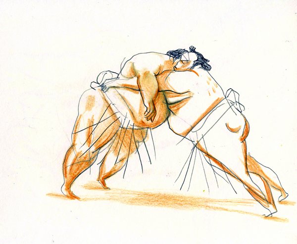 J’ai multiplié les croquis et une fois rentré à Bordeaux, ce que j’avais enregistré a commencé à se déployer. Le phénomène s’est intensifié, j’avais des visions plastiques, graphiques de ce que j’avais ressenti. Alors j’ai dessiné ces sensations. Il m’en venait sans arrêt… Le shikiri, le nirami-ai, Le tachi ai, les préparations dans le hanamichi, les juges, les rituels du combat, la lutte contre la pesanteur, l’argile du dohyô, le sel, l’eau, la sueur, les couleurs, la puissance et l’agilité, voyez-vous, j’ai morcelé et recomposé ce monde à ma guise au travers de suites de dessins.