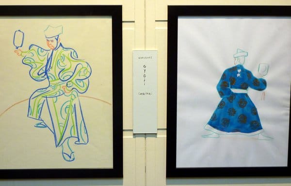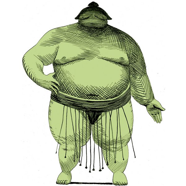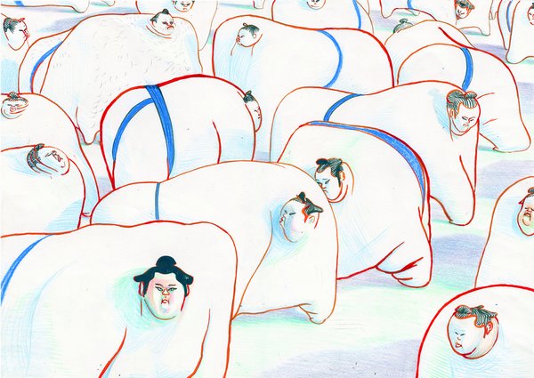 Ce qui m’intéressait, parce que paradoxal, était de dessiner des lutteurs de sumo sur du carton plume suspendu en l’air. Sur le pourtour du dohyô couraient des papiers blancs sur lesquels étaient séquencés à l’encre verte noire et rouge le déroulement du shiko , puis le shikiri. Il y a aussi eu ce dessin où j’ai représenté les lutteurs comme deux montagnes de roche face à face avec une petite vallée les séparant nettoyée au balai par deux minuscules préposés. Et puis, un lutteur volcan qu’une petite foule vient nourrir…