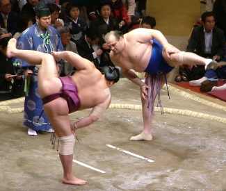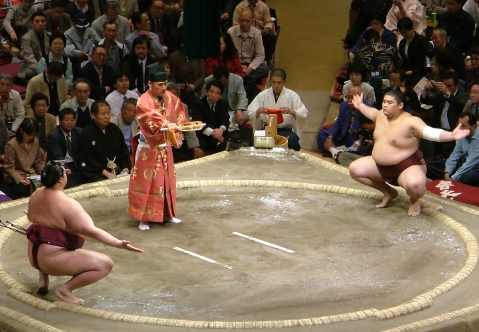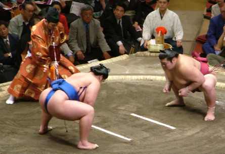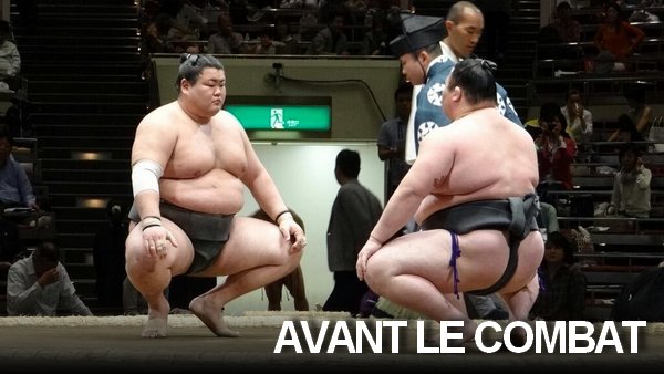 Enfin, les deux opposants se font face, accroupis derrière les shikiri sen, les marques blanches au sol qui délimitent la place des lutteurs. Le gyôji relève son éventail face à lui entre les lutteurs, signifiant enfin que le combat peut commencer. Dès que les deux lutteurs auront posé ensemble leurs deux poings sur le sol, le combat commence, et ils vont se jeter l’un sur l’autre avec la plus puissante poussée possible dans le but de déséquilibrer leur adversaire.