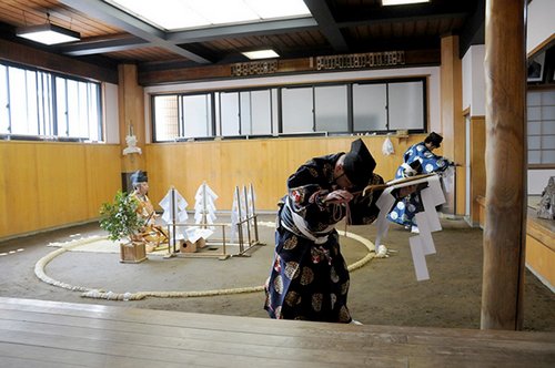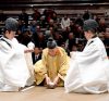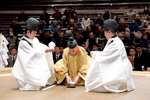 Une fois le dohyô construit, il ne reste plus qu’à le purifier afin d’attirer les bons esprits et chasser les mauvais. Cette tâche revient au tategyôji qui pour la cérémonie revêt un costume plus proche de celui porté par les prêtres shintô que celui qu’il porte habituellement au cours des arbitrages, même s’il y a bien comme une ressemblance entre les deux. Lors du dohyô matsuri, le tategyoji récite un texte que l’on pourrait apparenter à une prière, puis il enfuit dans le sol du dohyô une petite enveloppe appelée shizumemono qui contient des ingrédients sacrés : du riz, du sel, de la varech, des noix et de la seiche. Toutes ces affaires indispensables sont exposées, toujours accompagnées d’une brève note explicative en anglais.