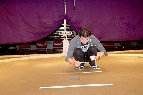 La tourelle n’est qu’un détail lors d’un tournoi, la pièce maîtresse est bien entendu le dohyô. Sans dohyô, pas de tournoi de sumo ! Là encore, des photos expliquent les étapes de construction d’une nouvelle aire de combat érigée la semaine qui précède le tournoi par les yobidashi. Un exemplaire de tawara (botte de paille qui sert à délimiter l’espace du dohyô) montre comment ils sont réalisés avec de la paille de riz.