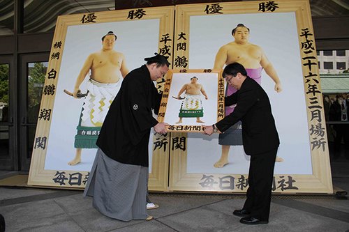Le même jour que la cérémonie qui se déroule toujours un samedi, les vainqueurs des deux précédents tournois découvrent leur portrait qui trônera dans le Kokugikan pendant 32 basho. Ils reçoivent une copie miniature de ce portrait sponsorisé par un grand journal national.