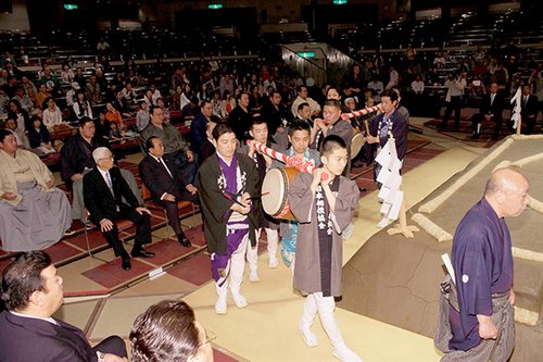 Une fois l’espace bénit, les yobidashi font trois fois le tour du dohyô en faisant résonner le son du taiko (tambour) puis ils partent dans le voisinage annoncer que le tournoi aura bien lieu le lendemain.