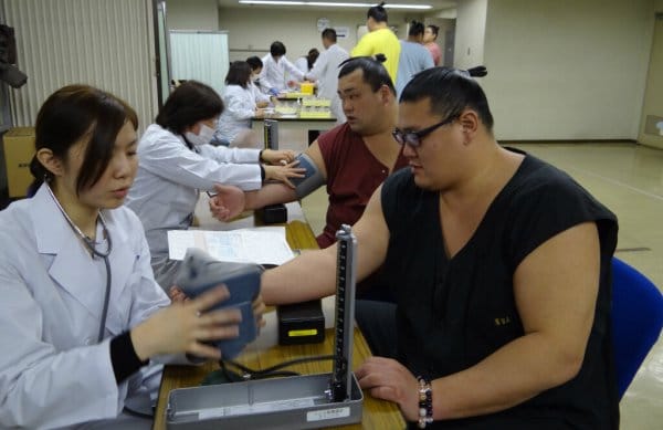 Les lutteurs de sumô sont des sportifs (presque) comme les autres et leur santé est régulièrement suivie par des bilans et toute une batterie d’examens. Avant l’hiver ils avaient tous reçu le vaccin contre la grippe saisonnière. Hier dans la clinique du Kokugikan s’est tenue la traditionnelle visite médicale pour les sekitori avec au programme : la pression sanguine, la taille, le poids, prise de sang, radio, et électrocardiogramme.