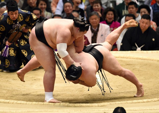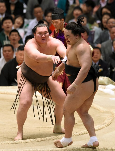 Terunofuji (13-2) kept expectations high for an electrifying showdown against Hakuho, when he tossed down hometown favorite Goeido (8-7) with an impregnable armbar technique in a superb display of balance and power against the ozeki.