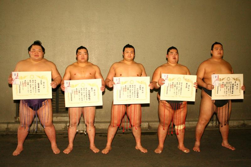 In the final bout, Hakuho and Harumafuji got into a shoving match before Harumafuji dug underneath and attempted several times to toss his opponent with an overarm throw. But Hakuho lined up his chest after securing a strong grip of the mawashi for the force-out.