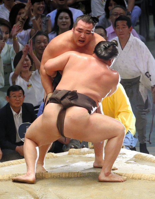 The 40-year-old got lifted over the ring by top-ranked Tochinoshin (8-7) and finished with a 3-12 mark.