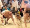 Hobbled ozeki Terunofuji (8-7) staved off demotion at the last gasp by finishing the tournament with a winning record, grabbing Brazilian sekiwake Kaisei’s left leg and tipping him over to an eighth defeat. Struggling with two bad knees, the Mongolian ozeki was in his element against a slower opponent. With Kaisei teetered with one leg in the area, Terunofuji seized the opportunity to finish him off.