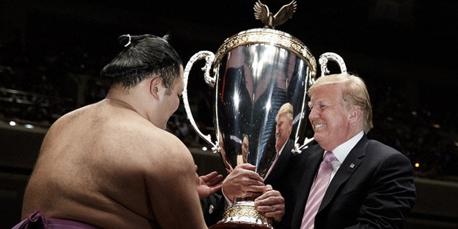 Malgré sa défaite d’aujourd’hui contre le komusubi Mitakeumi, au cours d’un combat pendant lequel l’ancien sekiwake l’a repoussé en yorikiri comme à son habitude, le maegashira 8 a participé à la remise des récompenses. En premier lieu, il a reçu la coupe de l’Empereur présentée par le premier ministre japonais, M. Shinzo Abe, puis la coupe du président des USA, remise par Donald Trump lui-même.