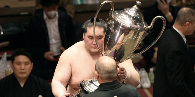 Son retour a été retardé jusqu’en juillet dernier après l’annulation du tournoi de mai en raison du coronavirus. Son résultat de 13-2 fait de lui le troisième lutteur de l’histoire à remporter un championnat tout en combattant depuis l’échelon le plus bas de la division makuuchi.