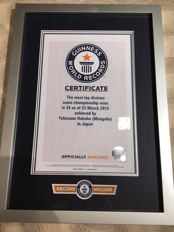 Le grand champion mongol Hakuho est entré dans le Guinness World Records qui salue sa brillante carrière ; Hakuho est titulaire du plus grand nombre de championnats remportés en makuuchi. Le comité du Guinness l’a récompensé pour son parcours, c’est ce que le yokozuna a révélé jeudi soir sur son blog.