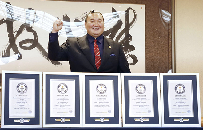L’ancien yokozuna Hakuho, et actuel coach sous le nom de Magaki, qui a récemment pris sa retraite à l’âge de 36 ans, a reçu cinq records reconnus par le Guinness World Records.