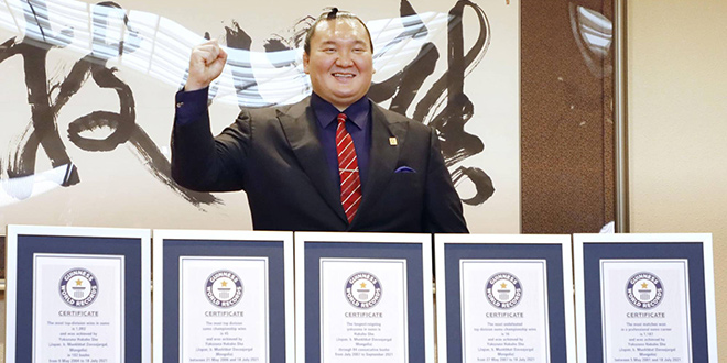 L’ancien yokozuna Hakuho, et actuel coach sous le nom de Magaki, qui a récemment pris sa retraite à l’âge de 36 ans, a reçu cinq records reconnus par le Guinness World Records.