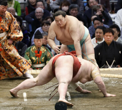 Un autre lutteur à l’ascension fulgurante, le maegashira 5 Onosato, a facilement maîtrisé le M6 Tsurugisho. Onosato, 23 ans, a obtenu une fiche de 11-4 en janvier, pour son premier tournoi dans la division makuuchi.