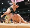 Harumafuji a été tout aussi expéditif pour sortir du cercle le komusubi Aoiyama qui n’a pas eu la résistance nécessaire pour s’y maintenir.