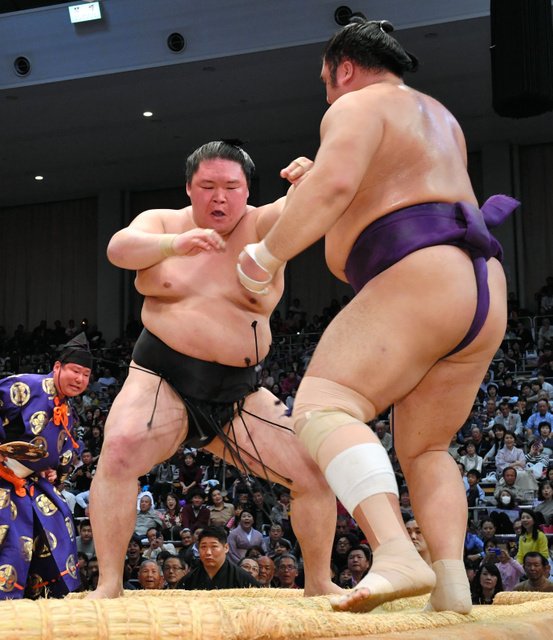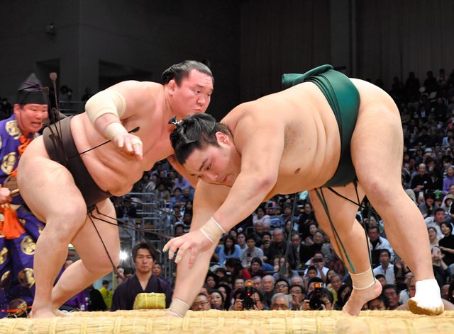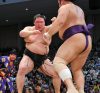 But Mongolian ozeki Terunofuji, who may be demoted if he performs poorly here as he finished the last tourney in September with a 4-11 record, fell to the tiny second-ranked maegashira Yoshikaze.