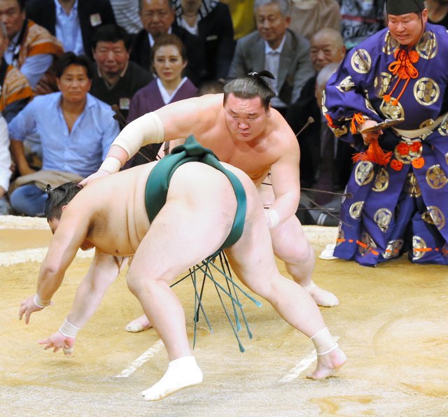Two other ozeki also started the 15-day meet with wins, with Kisenosato edging out top-ranked maegashira Aoiyama and Kotoshogiku needing only seconds to dispose of No. 2 maegashira Kaisei.