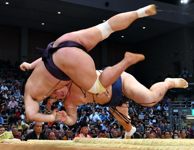 Yoshikaze, standing 176 centimeters tall, grabbed the 192-cm Terunofuji by the mawashi and literally lifted him over the ring’s edge.