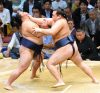 In other bouts, No. 3 maegashira Shodai, who hails from Kyushu main island’s Kumamoto Prefecture which is recovering after being hit by powerful earthquakes this spring, marched fourth-ranked Kotoyuki off the ring.
