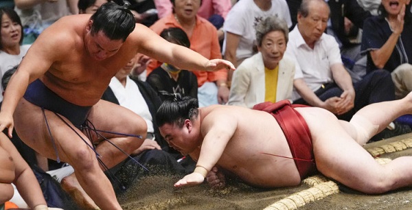 Le sekiwake Onosato était favori contre le maegashira 2 Atamifuji jusqu’à ce qu’il abandonne sa prise de ceinture sous le bras droit au bord, permettant au jeune lutteur de se retourner et d’être sur le point de gagner. Atamifuji a tenté désespérément de remporter la victoire, mais Onosato l’a giflé tout en gardant son pied gauche sur les bottes de paille. Onosato, qui a remporté 12 combats en mai, lorsqu’il a obtenu son premier titre, et neuf en juillet, est désormais à 12 victoires du quota pour la promotion à ôzeki, soit 33 victoires en trois tournois en tant que komusubi ou sekiwake.
