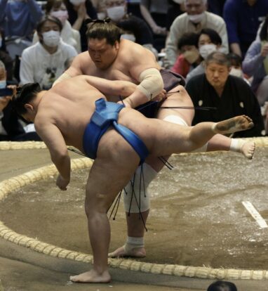Le nouveau komusubi affrontait aujourd’hui le yokozuna. Son plan n’était semble-t-il pas le bon. Au tachi-ai, il fonce vers le mawashi de son adversaire pour l’attraper, mais à ce jeu c’est Terunofuji qui reste le meilleur. Hoshôryu se fait donc transporté vers la sortie sans pouvoir opposer de résistance.