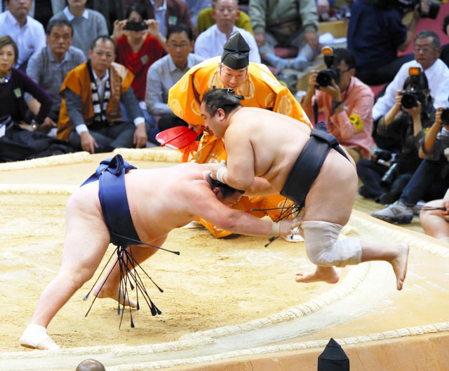 In the lower ranks, No. 11 maegashira Mitakeumi, the only newcomer to the makuuchi division at this tournament, kicked off with a win by thrusting out 12th-ranked Takekaze.