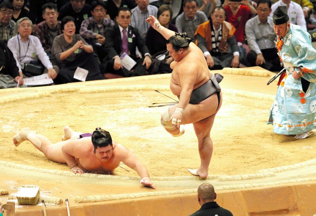 Fukuoka-born Kotoshogiku’s yorikiri win over Bulgarian-born second-ranked maegashira Aoiyama was met with thunderous applause from home fans and Kisenosato shrugged off an early attack from Osunaarashi and bundled the Egyptian No. 1 maegashira out.