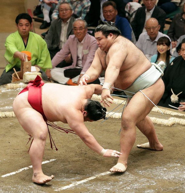 In other bouts in the upper ranks of the makuuchi division, Goeido kicked off the meet with a win, the ozeki taking second-ranked maegashira Okinoumi down with a pulling underarm throw.