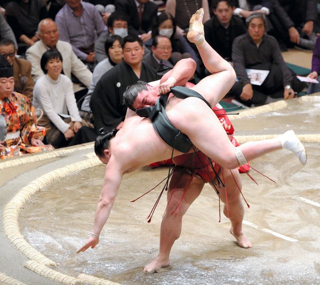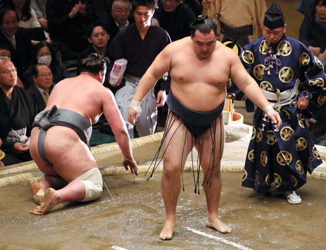 Two other ozeki were dealt early blows, however, with No. 1 maegashira Mitakeumi claiming his first win over ozeki Goeido in their third career bout.