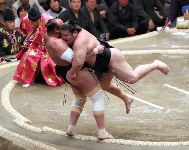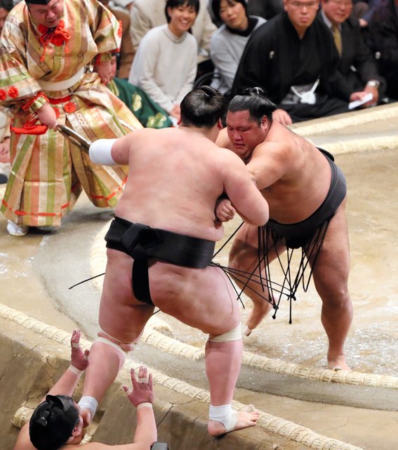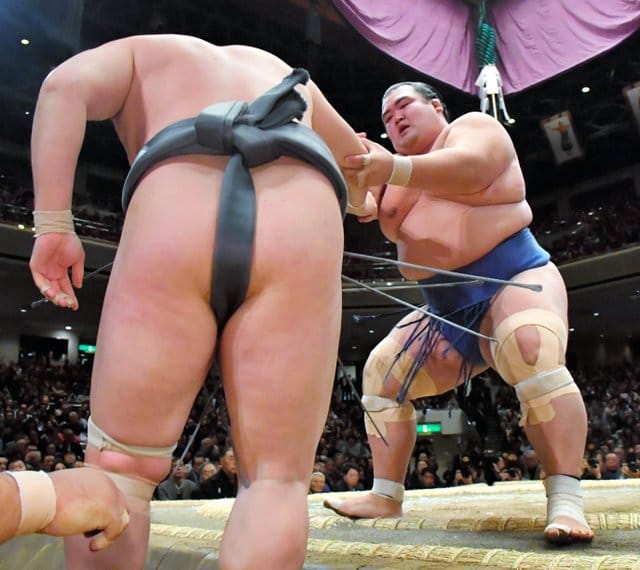 Ozeki Kisenosato, who had the most wins last year but has yet to win a grand tournament championship and stumbled when a yokozuna promotion was his for the taking, started the year well. He eased to a left underarm belt hold against top-ranked maegashira Takarafuji and grappled him out.