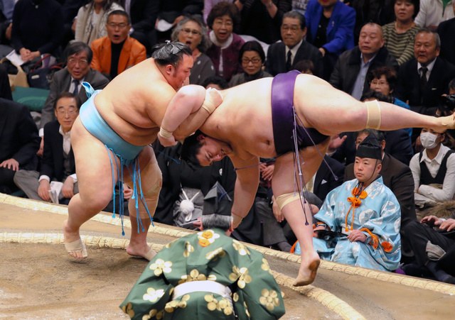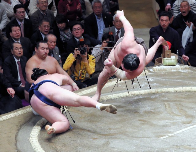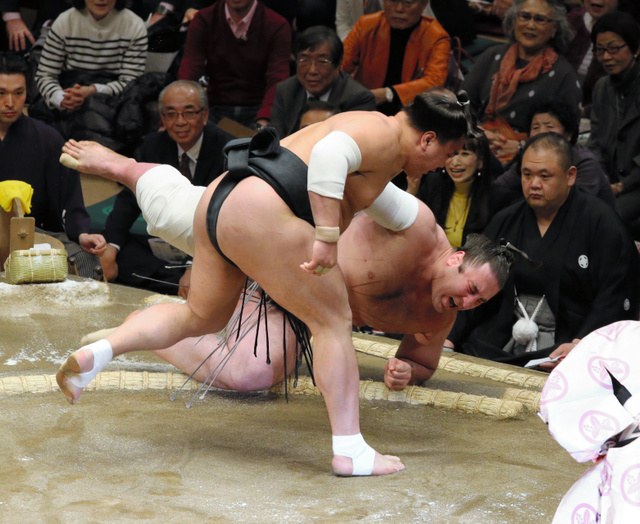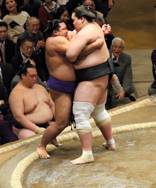 Ozeki Kisenosato, looking to end 10 years without a Japanese wrestler winning a grand sumo title by claiming his first, was fooled badly on the tachiai by Aminishiki. The top-ranked maegashira got off the mark quicker and was pressing down on Kisenosato’s shoulders in a heartbeat. The ozeki could do nothing but stumble forward to defeat. Aminishiki’s win was his 17th in 48 career matches against Kisenosato.