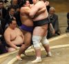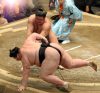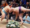 Goeido had gotten the ozeki wrestlers off to a winning start, after being pushed backward on the tachiai by Aoiyama. But the Bulgarian No. 2 maegashira overextended himself in trying to push the reeling Goeido from the ring. The ozeki regained his balance and dodged to one side as Aoiyama hurled himself out. Goeido improved his record against Aoiyama to 14-3.