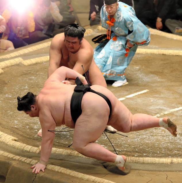 Shodai, one of two wrestlers making his makuuchi debut, got off to an auspicious start after appearing to be on the losing end of the initial charge. November’s juryo division champion, Shodai maintained his balance after being knocked backward and defeated fellow No. 12 maegashira Chiyotairyu with a beltless arm throw.