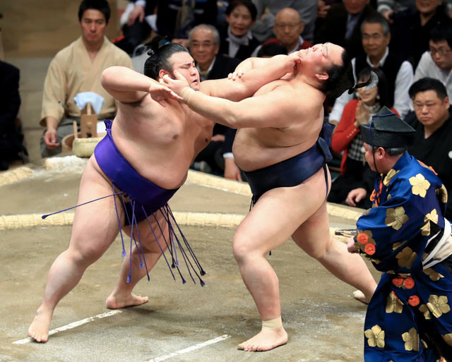No. 10 maegashira Aminishiki, in his first bout since dramatically maintaining his place in the top division on the final day of the Kyushu Grand Sumo Tournament in November, fell to No. 11 Kotoyuki.