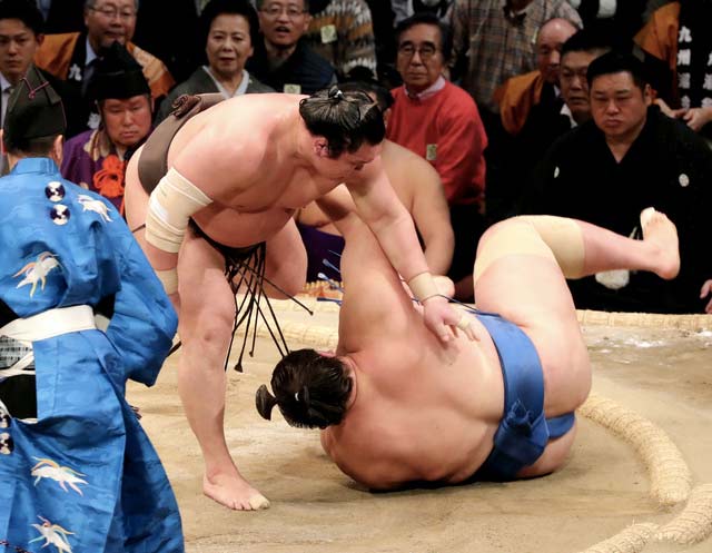 Ozeki Takayasu (7-3) yanked down komusubi Kotoshogiku, sentencing the former ozeki to a losing 2-8 record in the process.