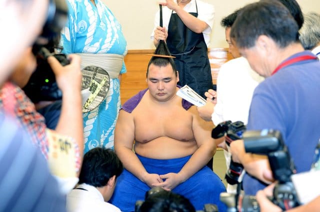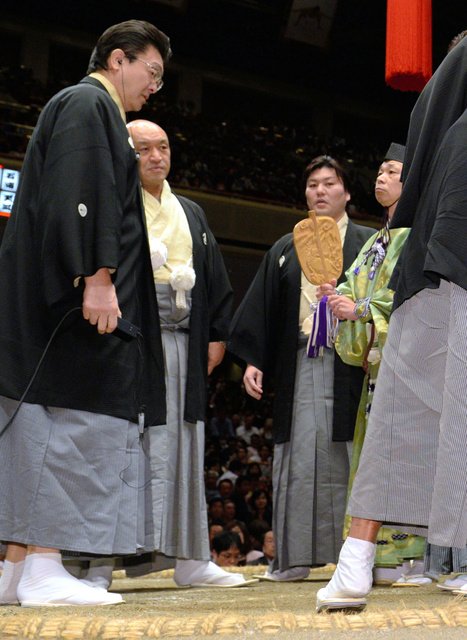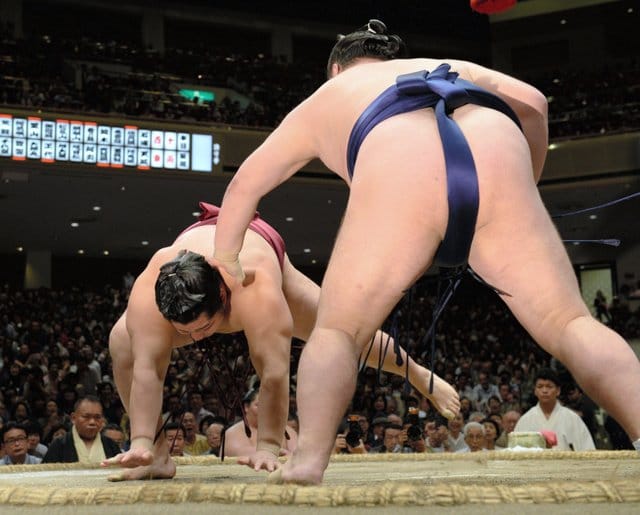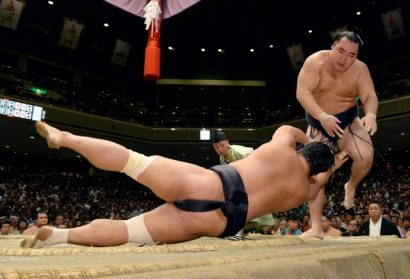 In the day’s final bout, Myogiryu was awarded an oshidashi over Kakuryu after ringside judges decided the yokozuna’s heel had touched the dirt outside the ring first when both went over the edge.
