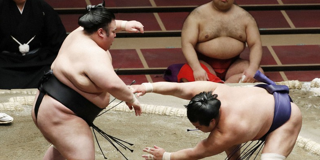 Among the struggling members of the elite ranks, sekiwake Takanosho (5-5) drilled out komusubi Takayasu (5-5), while sekiwake Mitakeumi (6-4) was pushed out from behind by No. 5 Kotoshoho (6-4), who sidestepped his opponent’s initial charge.