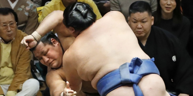 The demotion-threatened « kadoban » ozeki, who needs a winning record at the year’s first basho to keep his rank, got turned around by No. 6 Takarafuji (5-5) and was pushed out from behind.