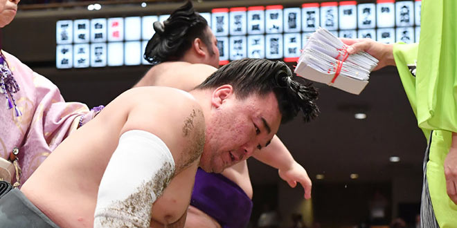 In the day’s final bout, yokozuna Harumafuji was dealt his fourth loss when he was slapped to the surface by No. 5 maegashira Takakeisho, both standing at 6-4.