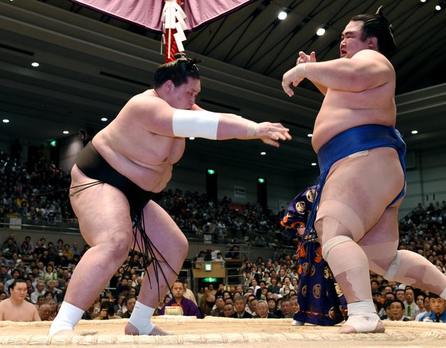 Rival yokozuna Harumafuji (7-3), who had lost his two previous bouts, won the contest against Brazil’s Kaisei (4-6) — but just barely. The yokozuna, who appears to be bothered by his right forearm, came close to the edge twice before toppling his opponent with a left-handed underarm throw.