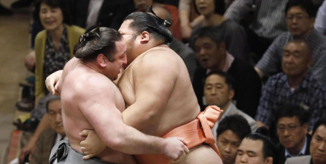 In the day’s shortest bout, Kakuryu slapped down No. 5 maegashira Kotoshogiku (6-4) in half a second, earning an easy win but also the disapproval of some sumo purists in the crowd for his use of a frowned-upon evasive technique.