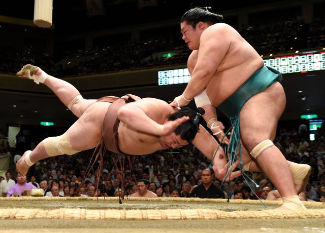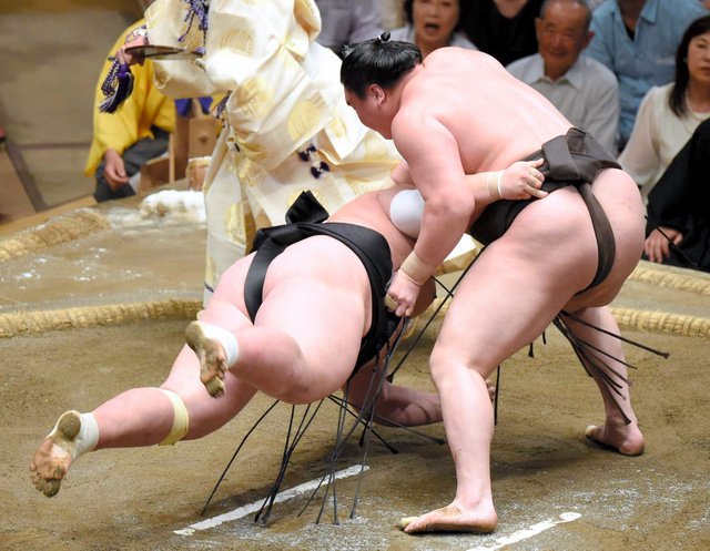 Hakuho’s Mongolian compatriot and fellow grand champion Harumafuji (8-3) returned to winning ways, getting his head into ozeki Goeido’s (6-5) chest and charging him over the ridge.